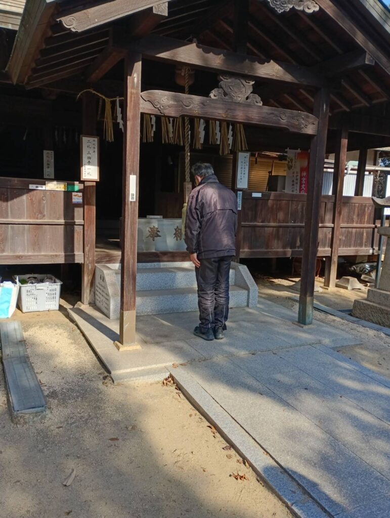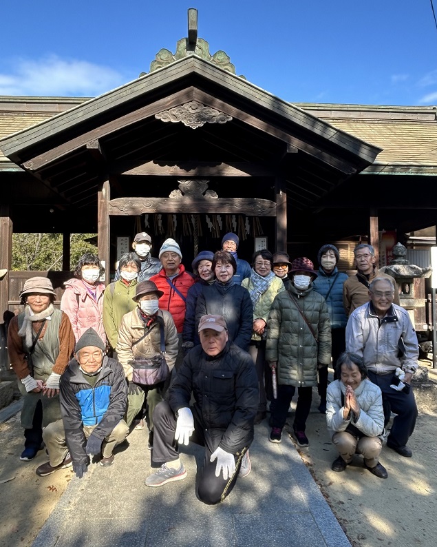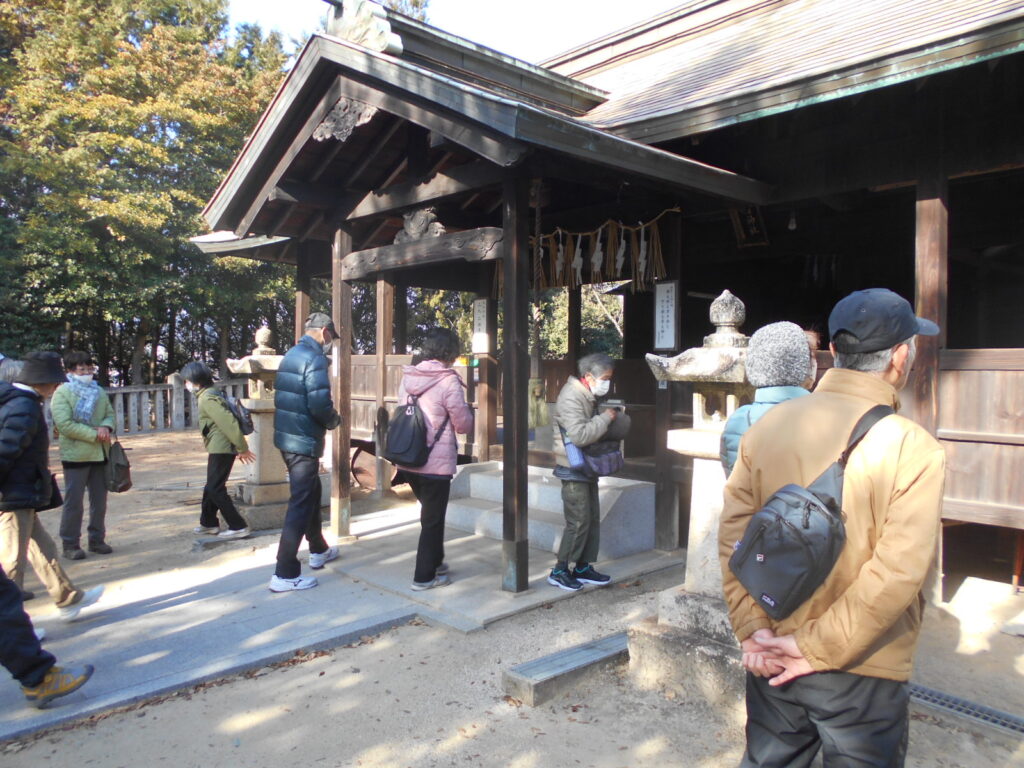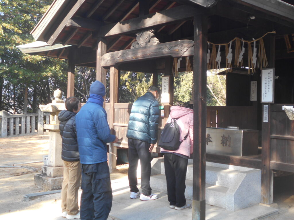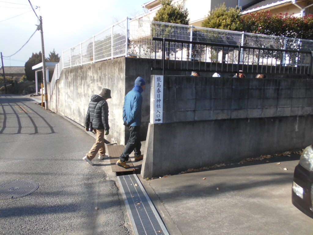 次の目的地は春日神社です。幾段の石畳をゆっくり踏みしめ、祠へ到着。参加された皆さんは今年の家内安全・無病息災を祈願されていました。