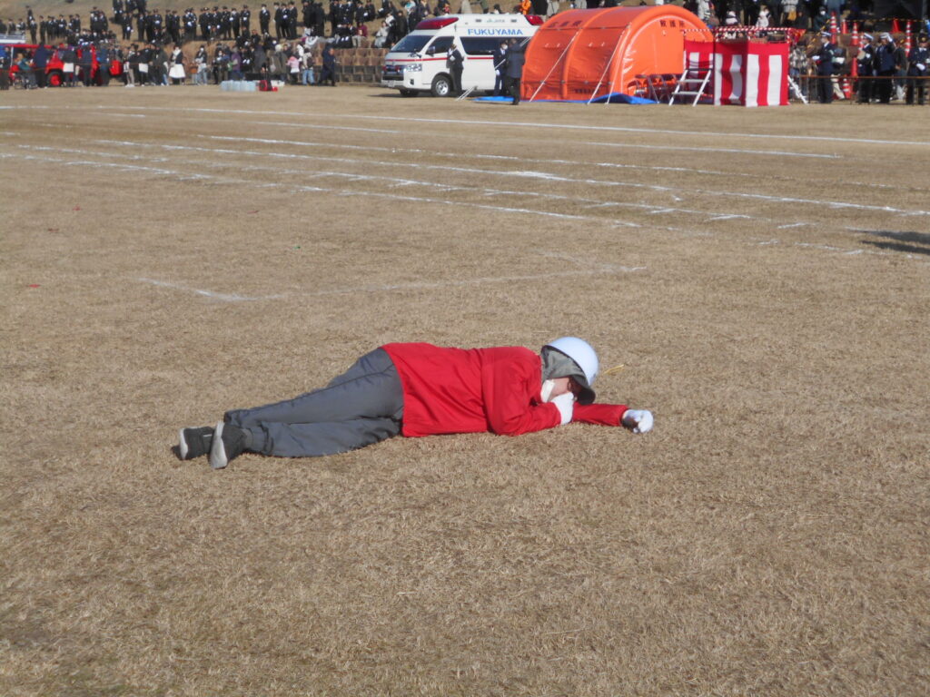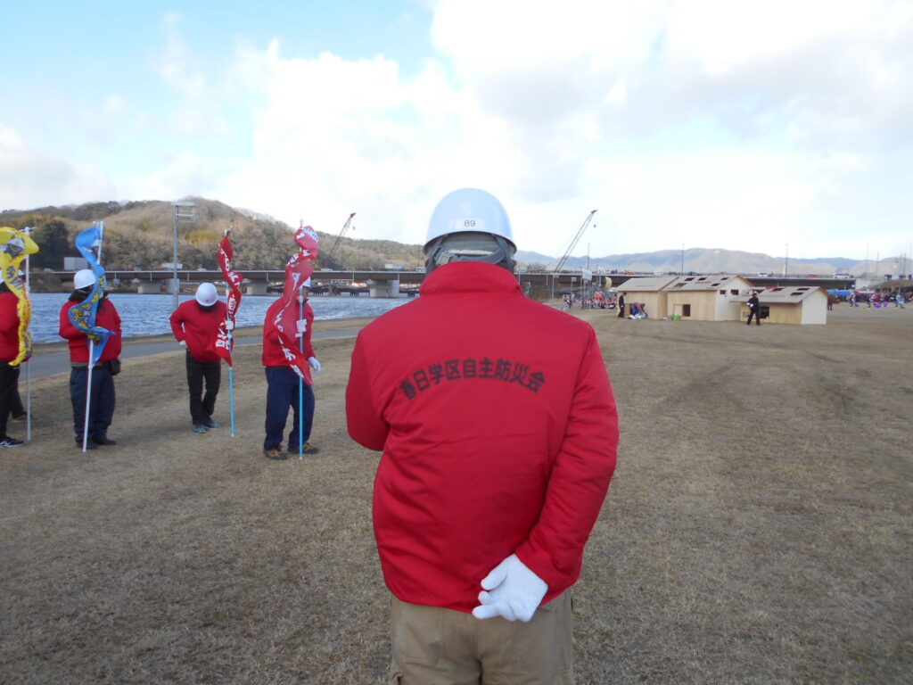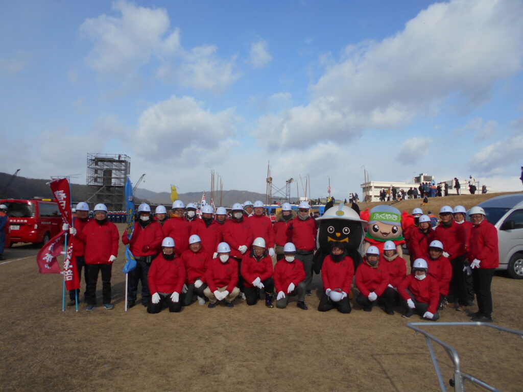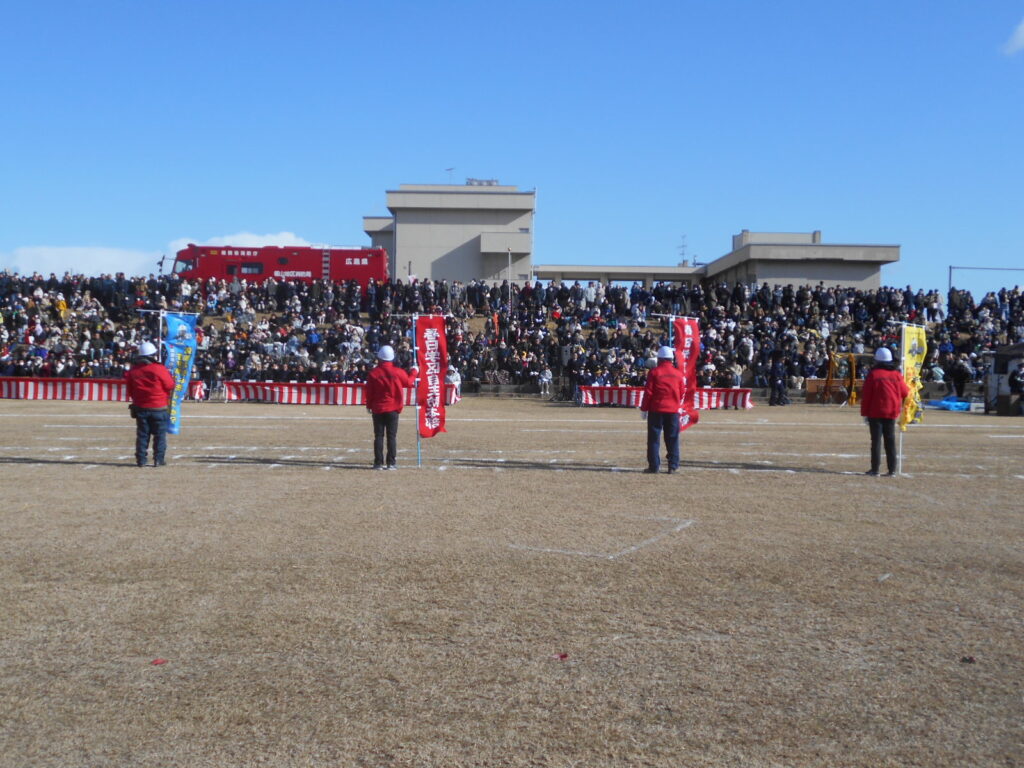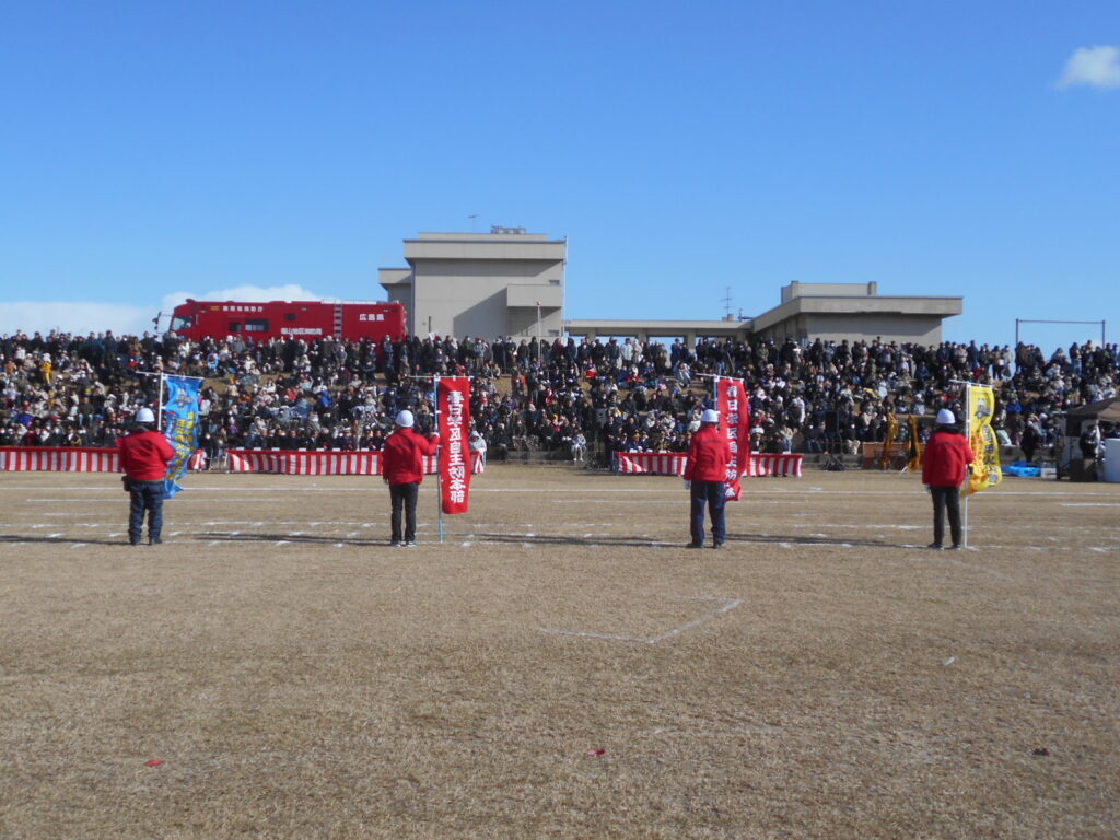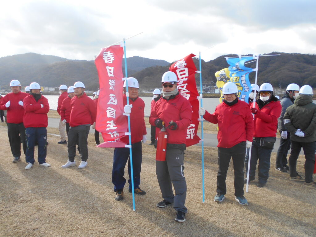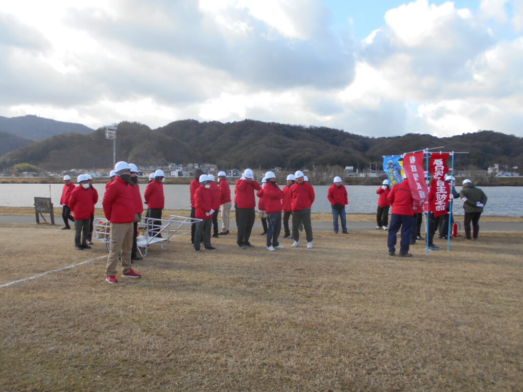 ◇1月11日(日)寒風吹きすさぶ中、芦田川河川敷で行われた福山市消防出初式へ春日学区自主防災会として参加しました。