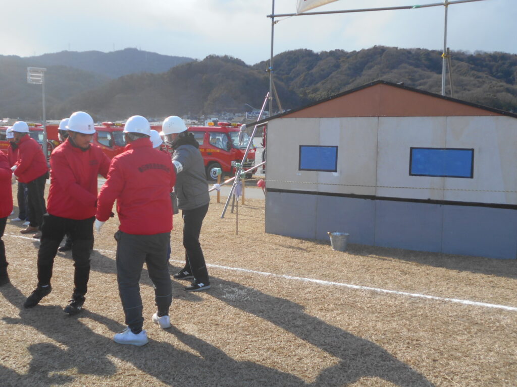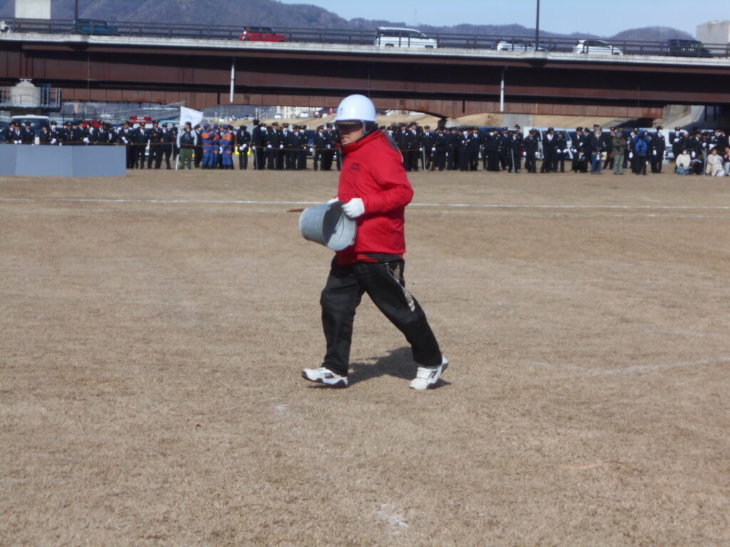 自主防災会として実施した内容は、バケツを叩きながら火事だ~!と叫ぶ役回り。負傷者の救助、消火器での初期消火、バケツリレ-にて消火活動を行いました。