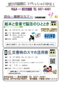 2025年9月16日 / 最終更新日時 : 2025年9月16日 staff_c イベント 絵本と音楽で脳活のひととき開催日: 2025年10月7日カテゴリー: イベント2025年 10月日月火水木金土2829301234567891011脳活12131415161718学区民運動会春日座談会春日座談会19202122232425春日座談会春日座談会春日座談会2627282930311春日座談会春日座談会と き 令和7年10月7日(火)10時00分~11時30分ところ 春日交流館詳細は、9月1日発行の春日交流館だよりをご覧ください